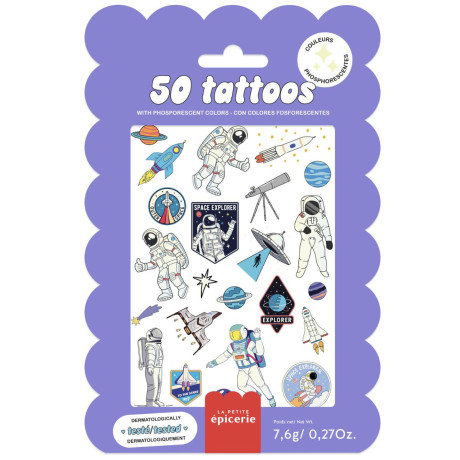 קעקועים לילדים, מלאים שיק וסטייל. בערכה זו 50 קעקועים עם אלמנטים זוהרים בחושך. נבדק דרמטולוגית. מתאים לגילאי 3+