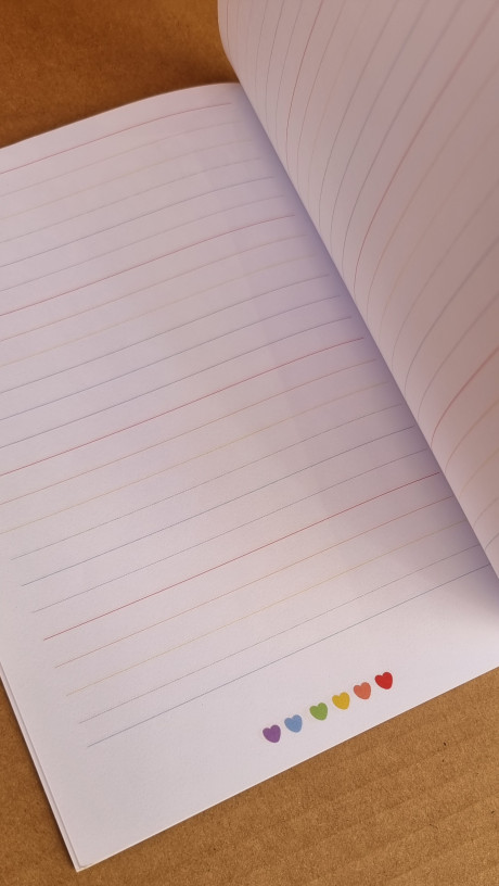 מחברת בגודל A5 כריכה רכה. 18 דפים (36 עמודים) פנים המחברת הוא שורות בצבעי הקשת :)