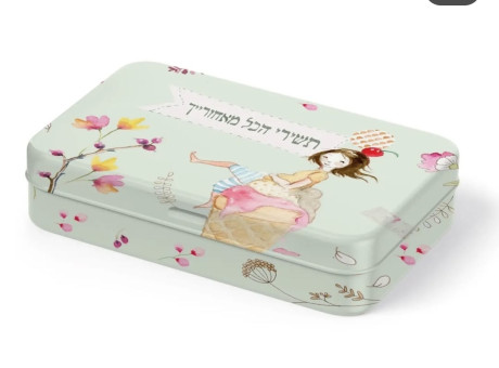 קופסת פח עם עיצוב משמח ועם כיתוב בעברית! תשירי הכל מאחורייך. גודל הקופסה 11*8*2 ס"מ