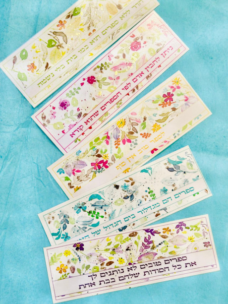 סימניה מנוילנת בגודל 5*15 ס"מ. ציור בצבעי מים ונגיעות עלי זהב.